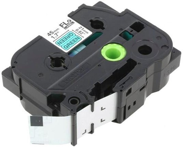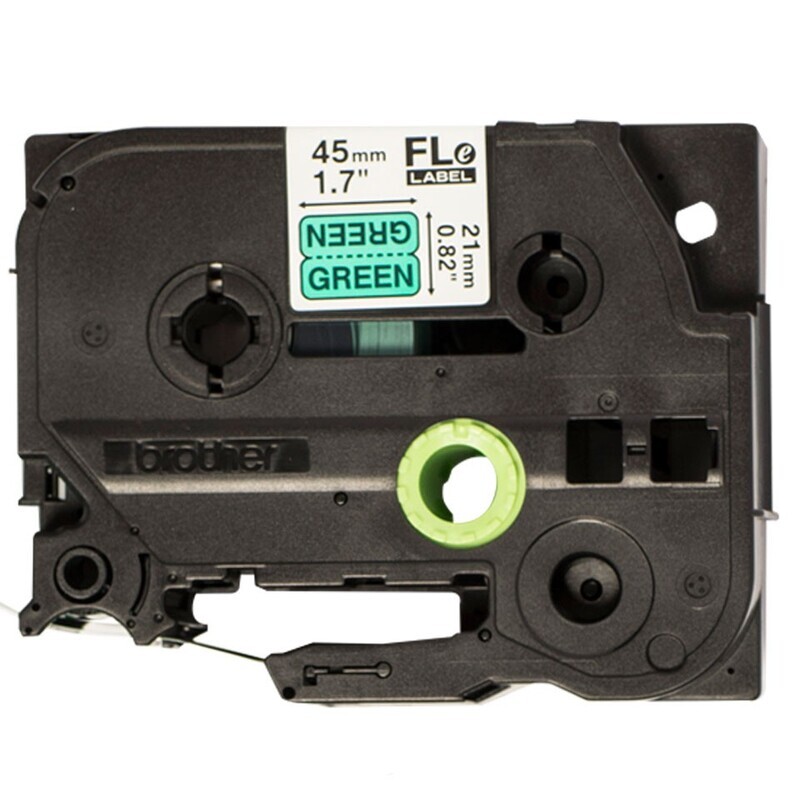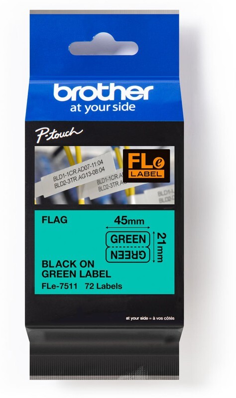 BROTHER FLE-7511 картридж с оригинальными пластиковыми этикетками 45 мм x 21 мм для маркировки провода Флажком, 72 штуки, черный шрифт на зеленом фоне.